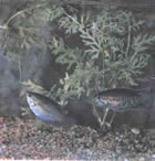 Можно наблюдать и такую трогательную картину: пара трихогастров поглаживает этими нитями друг друга. Во время нереста одни самцы трихогастров становятся почти черными, другие ярко окрашиваются. Матерые самцы жемчужного трихогастра имеют непарные плавники с длинной бахромой. При содержании стайкой эти рыбки пугливы и прячутся в зарослях от человека. За порцией воздуха обычно устремляется к поверхности, как по команде, вся стая. Еще раз повторю: залог успеха содержания трихогастров – чистый, озелененный, хорошо освещенный аквариум с ровной температурой воды и разнообразными кормами; в рацион трихогастров входят низшие зеленые водоросли, которые они постоянно щиплют.