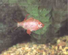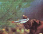 – Рыбка очень мала, не более четырех сантиметров. Но окрашена красиво: сама зеленовато-синяя, а плавники вишнево-красные. У молодых рыбок по бокам сверкает неоновым блеском неширокая полоска, а у взрослых вся красота в контрасте синего и красного.