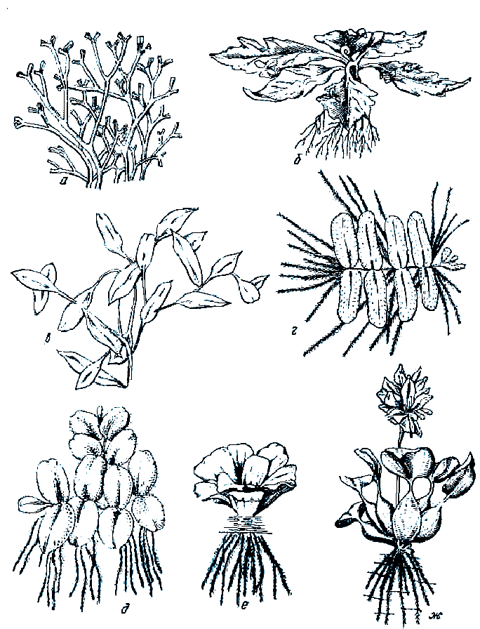 К этой биологической группе относятся наиболее важные для аквариума растения, интенсивно производящие работу по поглощению растворенных в воде органических и неорганических веществ (рис. 34). Эти растения поглощают используемые ими вещества в основном поверхностью своих листьев; слаборазвитые тонкие нежные нити корней служат лишь для прикрепления. Многие растения этой группы могут размножаться из небольшого кусочка. Листья тонкие, нежные, часто мелкоперистые. Мелкорассеченные листья имеют очень большую поверхность, что увеличивает их способность к ассимиляции.