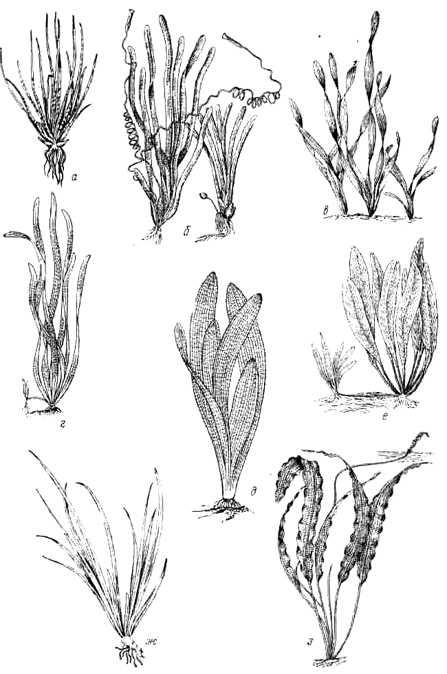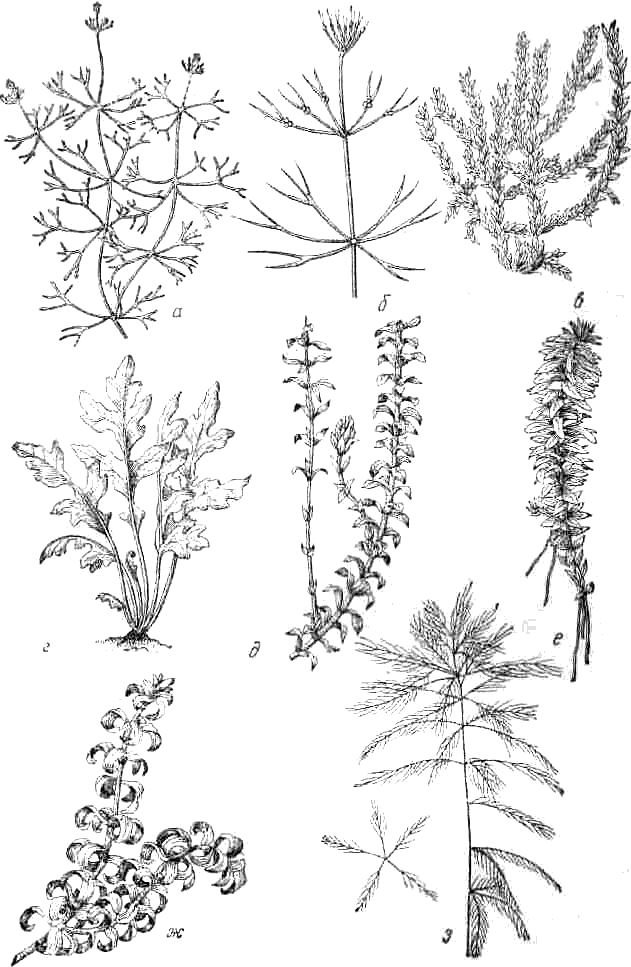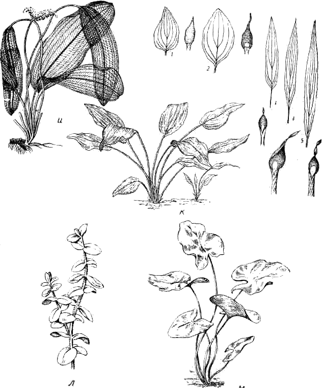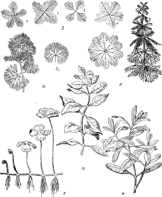 а — блестянка, б — топняк, в — фонтиналис, г — водяной папоротник, в — элодея канадская, е — элодея зубчатая, ж — лагаросифон, з— перистолистник бразильский (листья перистолистников: 1 — мириофилум вортикулятум, 2 — м. спикатум, 3 —м. элатиноидес, 4 — м. хинуроидес), и — кабомба каролина (и, — лист к. акватина), к — амбулия, л — марсилия, м — людвигия, н —- гигрофила