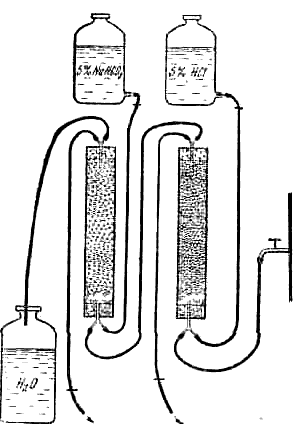 Процесс обессоливания при помощи ионитов проходит следующим образом. Установка состоит из двух стеклянных цилиндров длиной 50—60 см и диаметром 40—50 мм, укрепленных на штативе (рис. 66). Каждый цилиндр снабжен на концах резиновыми пробками со вставленными в них стеклянными трубками Первый цилиндр (с катионитом) соединяется с одного конца резиновым шлангом с водопроводным краном, а с другого — с цилиндром, содержащим анионит, из цилиндра с анионитом течет обессоленная вода. Чтобы вместе с водой не попадали частицы ионита, на дно цилиндров кладутся либо стеклянная вата, либо стеклянные палочки, а затем стеклянная вата. И катионит, и анионит перед употреблением необходимо залить водой в открытом сосуде и дать постоять в течение нескольких часов, так как иониты разбухают и могут разорвать цилиндры. После набухания катионит и анионит обрабатываются по-разному. Катионит обычно сразу же засыпают в цилиндр и через него пропускают 1,5—2 л раствора 5%-ной соляной кислоты в дистиллированной воде (в зависимости от количества катионита, помещенного в цилиндр, и его обменной емкости). Промыв катионит 2—3 л дистиллированной воды, его можно использовать.