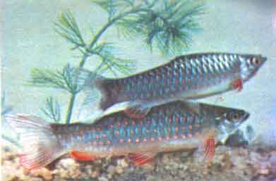Копеина Арнольда (Copeina arnoldi Regan). Родина этой копеины — бассейны рек Амазонки и Пары. Они живут в старицах и протоках, густо заросших растениями, со стоячей или медленно текущей водой. В Европу впервые завезены в 1905 г. До 1941 г. они у нас были, но затем исчезли. Рыбы вновь завезены к нам в 1958 г. Самцы достигают 8 см длины, самки несколько мельче.