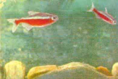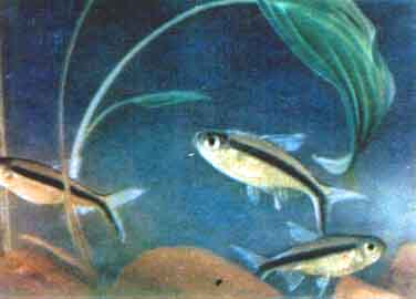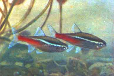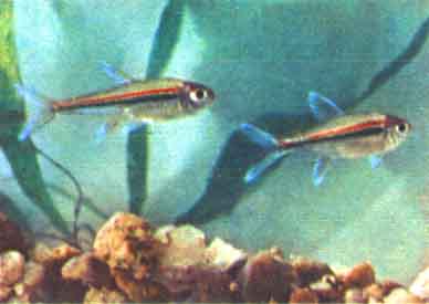 Неон (Hyphessobrycon innesi Myers). Неоны водятся в р. Укаяли, притоке Амазонки. В Европу они впервые привезены в 1936 г., к нам — в 1955 г. Размеры их достигают 4 см длины; самец, как правило, меньше самки.