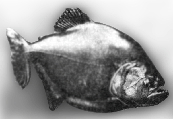 Харациниды Америки представлены значительно богаче; здесь имеются и растительноядные, и питающиеся животной нищей, и поедающие детрит (продукты разложения животных и растений). К американским харацинидам относятся знаменитые пираньи — стайные рыбы (до 30 см длины), нападающие даже на крокодилов и крупных млекопитающих, таких, как быки и лошади (рис. 70). Известны случаи нападения пираньи и на человека. Сложены легенды, повествующие о кровожадности пираньи. Эти рыбы приобрели ужасную известность благодаря страшным рассказам о том, как они могут содрать и съесть с животного (или с человека) все мясо за несколько минут, оставляя лишь один обглоданный скелет. Правда ли это? Факты говорят о том, что если речь идет о видах Serrasalmus spilopleura, то это так. Опасность их обычно очень сильно преувеличивают. Всего около 16 видов этих рыб, и лишь четыре из них считаются опасными для людей. Другие же виды вполне безобидны для человека, хотя и могут наносить болезненные укусы. Особенно опасны Serrasalmus spilopleura. Они населяют реки бассейна Амазонки и Ориноко. Рыбы достигают 24 см длины.