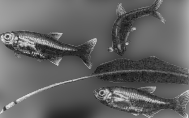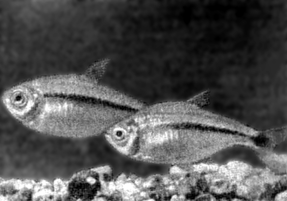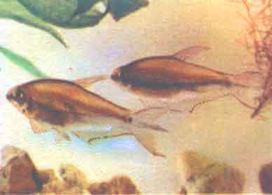 Тетрагоноптерус (Hemigrammus caudovittatus Е. Ahl.). Тетрагоноптерусы водятся в р. Ла-Плата. В Европу они впервые завезены в 1922 г., у нас были широко распространены до 1941 г. и сохранились до сих пор. В аквариумах они обычно достигают 5—6 см длины, иногда — 12 см.