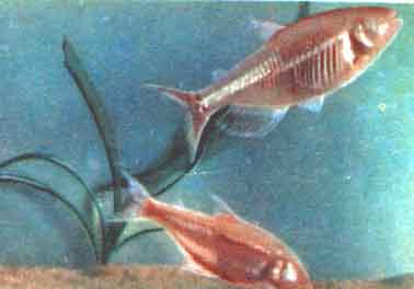 Афиохаракс (Aphyocharax rubripinnis Pappenheim). Эти афиохараксы водятся в бассейне р. Параны (см. цвета, табл. Ill), в Европу впервые завезены в 1906 г. В СССР были до 1941 г., вторично доставлены к нам в 1957 г. Самка достигает 5,5 см длины, самец обычно несколько мельче.
