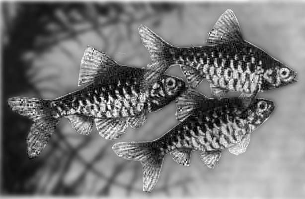 Пунтиус (барбус) двуточечный (Puntius bimaculatus Bleeker). Водятся двуточечные пунтиусы в бассейне р. Конго (см. цветн. табл. VI). В СССР они впервые завезены и размножены в 1950 г.