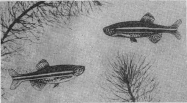 Данио рерио (Brachydanio rerio Hamilton-Buchanan). Данио рерио обитают в водоемах восточного побережья Передней Индии (рис. 85). В Россию они завезены в 1905—1906 гг., в СССР вторично привезены в 1950 г. Рыбы достигают 6 см длины, обычно не более 4,5 см.