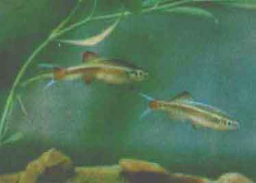 Кардинал (Tanichthys albonubes L.). Кардиналы распространены в быстро текущих ручьях на юге Китая. В Европу кардиналы завезены в 1938 г., в СССР — в .1946 г. Они достигают 4 см длины, обычно 2,5—3 см