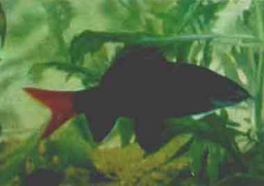 Тело и плавники у них окрашены в черный цвет. Хвостовой плавник огненно-красный.