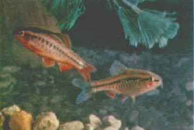 Пунтиус (барбус) огненный (Puntius conchonius Hamilton-Buchanan). Огненные пунтиусы (барбусы) живут в стоячих или медленно текущих водах северной части Индии (Бенгалия и Ассам). В Европу эти барбусы завезены в 1903 г., в СССР их разводят с 20-х годов. В природе они достигают 14 см длины, в аквариумах обычно 6—8 см.