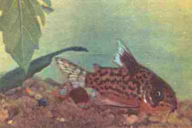 Сомик леопардовый (Corydoras leopardus Myers). Леопардовые сомики населяют небольшие протоки в нижнем течении Амазонки. В Европу они впервые завезены в 1933 г., в СССР — в 1960 г. Самки достигают 6 см длины, самцы несколько мельче и стройнее.