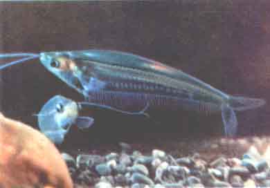 Стеклянный сомик (Kryptopterus bicirrhis Cuvier u. Valenciennes). Родина этого сомика Индия и Индонезия (см. цветн. табл. IX). В Европу они впервые завезены в 1934 г., в СССР — в 1964 г. Рыбы достигают 10, иногда 15 см.