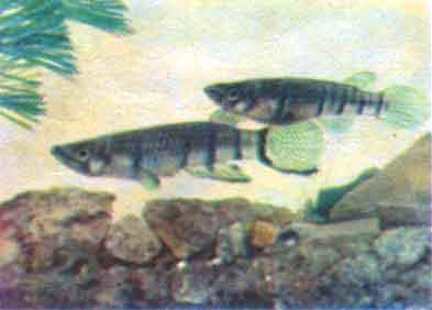 Афиосемион двухполосый (Aphyosemion bivittatum hollyi Lonnberg). Рыбы распространены в болотах и маленьких водоемах Камеруна в Западной Африке. В Европу они впервые завезены в 1908 г., и СССР — в 1963 г. (и разведены). Самцы достигают 6 см длины, самки мельче.