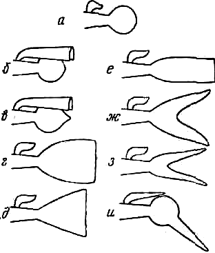 а — круглохвостая, б — шарфовая круглохвостая, в—шарфовая шилохвостая, г —шлейфовая, б — юбочная, е — флагохвостая, ж — тупая пилка, з — острая вилка, и — ленточная
