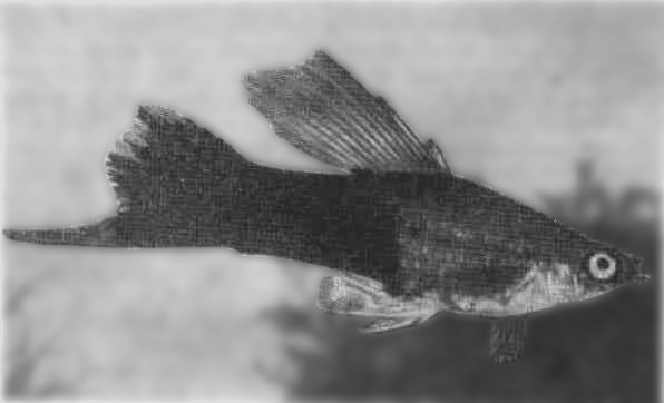 Меченосец (Xiphophorus helleri Heckel). Этот меченосец встречается в водах Мексики, Гватемалы и Гондураса. В Европу рыбы впервые были завезены в 1909 г., а вскоре и в Россию. Самцы достигают 8 см длины, самки — 12 см. В аквариумах обычно те и другие примерно в два раза мельче.