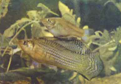 Гуппи (Lebistes reticulatus Peters). Гуппи распространены в водоемах Венесуэлы, Северной Бразилии, Гвианы, а также на островах Барбадос и Тринидад, В Европу они впервые завезены в 1908 г., а вскоре появились и у нас. Самцы гуппи длиной до 4 см, самки — 6 см.