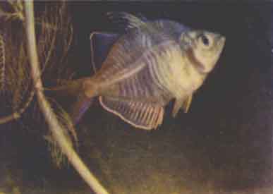 Эта рыба весьма оригинальна как по окраске, так и по форме. Форма тела такая же, как у других представителей рода. Тело высокое, сплющенное с боков. Спинной плавник состоит из двух резко разграниченных частей: передняя, несколько более высокая треугольная, во время движения рыбы часто складывается и распускается подобно вееру, задняя округлая снизу, симметрично ей расположен анальный плавник той же формы. Хвостовой плавник вырезан довольно глубоко. Рыбки прозрачны, у них можно рассмотреть позвоночник и плавательный пузырь. Вся прелесть окраски этих оригинальных рыб проявляется в отраженном свете. Самец светло-оливкового цвета. Передняя часть спинного плавника в верхней половине темная, задняя часть спинного и анальный плавник розоватые, по краю последних двух имеется тонкий голубоватый, иногда ярко блестящий кант. На теле расположены две вертикальные широкие "полосы, как бы светящиеся золотисто-голубоватым светом. Грудные плавники красноватые. Самки окрашены скромнее, менее интенсивно, голубых оторочек на плавниках у них нет.
