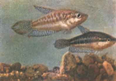 Купанус (Macropodus cupanus cupanus Cuvier, Valenciennes). Купанусы водятся в прибрежной зоне маленьких водоемов Индии и Цейлона (рис. 111). В Европу они впервые завезены в 1903 г., к нам — в 1958—1959 гг. Купанусы достигают 7,5 см, обычно 5—6 см.
