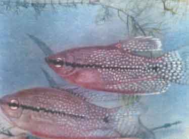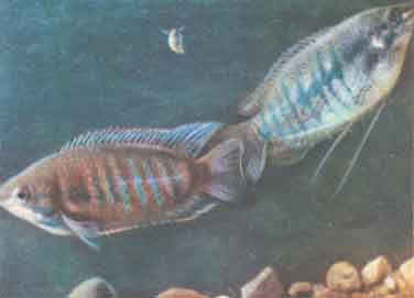 Гурами жемчужный (Trichogaster leeri Bleeker). Жемчужные гурами водятся в мелких густо заросших водоемах Малаккского полуострова, Индии и Индонезии. В Европу впервые привезены в 1933 г., в СССР — в 1947 г. Самцы достигают 11 см, самки несколько мельче.