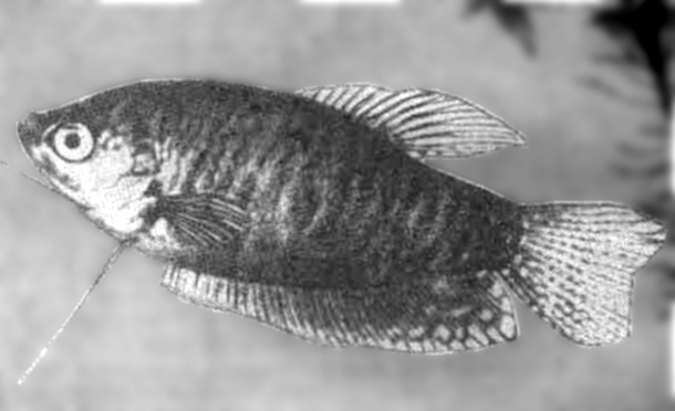 Гурами пятнистый (Trichogaster trichopterus Pallas). Пятнистые гурами распространены в водах Малаккского полуострова, Южного Вьетнама и больших островов Индонезии (рис. 112). В Европу они впервые завезены в 1896 г., у нас разведены в дореволюционное время. В природных условиях эти рыбы достигают 15 см длины, в аквариумах — 10—11 см.