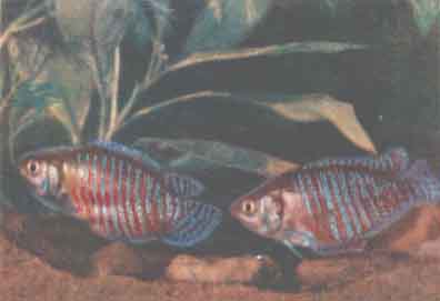 Лябиоза (Colisa labiosus Day). Лябиозы распространены в водоемах Индии и Бирмы. В Европу они впервые завезены в 1904 г., в СССР были широко распространены до 1941 г. Вновь доставлены к нам в 1950 г. Обычно рыбы достигают 10 см, в аквариумах — 7—8 см.