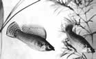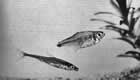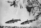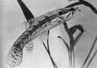 2) самка мечет икру на нижнюю сторону свисающих над водой листьев и затем родители начинают сбрызгивать икринки водой для защиты от высыхания и продолжают это до тех пор, пока не выклюнутся личинки, падающие прямо в воду. Такой оригинальный способ, по нашим данным, присущ только одному виду—плескающейся тетре Copeina arnoldi;