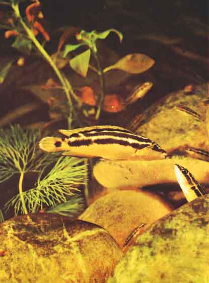 Удлиненное тело Julidochromis ornatus из Танганьики помогает ей свободно двигаться в расщелинах между камнями. Кроме того, это территориальные рыбы, ревниво охраняющие свои убежища от непрошеных гостей (фото X. Хансена)