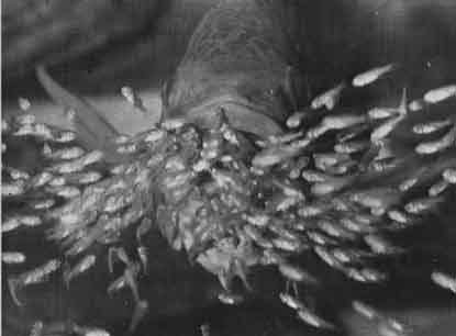 Выводок испуганных личинок тиляпии находит убежище у матери. Эти двухдневные рыбки еще слишком малы и легко умещаются в ее огромной ротовой полости (фото Г. Маркузе)