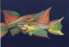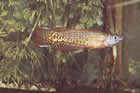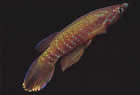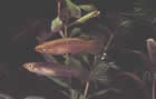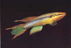 Aphyosemion australe (афиосемион южный). Родина – регион мыса Лопес, Африка. Достигает длины 5см. Эта прелестная рыба является давней любимицей аквариумистов, а самцы по праву держат первенство среди яркоокрашенных рыб. Шоколадное тело самца с несколько более желтым брюшком усыпано множеством темно-красных крапинок и штрихов разной величины. Грудные и брюшной плавники ярко-оранжевые, анальный – оранжевый у основания с пурпуровой каймой и белым кончиком, спинной – зеленовато-желтый с красными крапинками, фиолетовой каймой и также с белым кончиком. Хвостовой плавник лировидный, на его синих центральных лучах красные крапинки и пурпуровая кайма, верхние лучи желтые, нижние – оранжевые, и те и другие с белыми кончиками. Самка имеет более светлую коричневую окраску и закругленные плавники, ее единственное украшение – несколько разбросанных пятен.