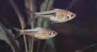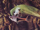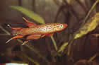 Rasbora heteromorpha (расбора гетероморфа, или расбора-арлекин). Эта рыбка длиной 5см пришла к нам из Малайзии. Мы выделили ее из группы других расбор, поскольку она иначе нерестится. Это одна из самых миролюбивых и прелестных аквариумных рыб, полностью заслужившая свою огромную популярность. Передняя часть тела серебристая, задняя – темно-красная с большим бархатисто-черным треугольником. Спинной и хвостовой плавники красные с белым окаймлением, первые лучи анального плавника также красные. Под лучами солнца у рыбы появляется удивительно красивый фиолетовый отблеск. Из-за одинаковой окраски отличить самок от самцов удается только в нерестовый период по отяжелевшим брюшкам. В целом же у самок более полное тело, треугольник на задней части тела выражен слабее.