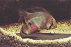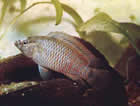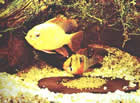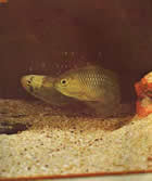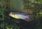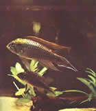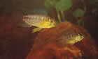 Pelvicachromis pulcher (пестрый попугайчик, цихлида-попугай). Раньше был известен как Pelmatochromis kribensis. Эта рыба была завезена из Камеруна, Западная Африка. Длина самцов 7,5, самок 5см. Верхняя часть тела коричневая с золотистой полосой, нижняя – золотистая с блестящим винно-красным пятном, покрывающим все брюшко. На верхней части головы три черные полосы. Спинной и анальный плавники с фиолетовым отливом украшены золотистой и красной каймой. У самки на заднем конце спинного плавника есть один или несколько "глазков", у самца "глазки" расположены на верхнем краю хвостового плавника. Брюшные плавники темно-красные с фиолетовым окаймлением в передней части. Во время нереста задняя половина тела самки становится темно-коричневой, а передняя – медной.