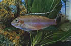 Apistogramma reitzigi (карликовая апистограмма Рейцига). Происходит из бассейна Амазонки, максимальная длина 6,25см. Эту апистограмму легко узнать по большим колышущимся спинному и анальному плавникам, последние лучи которых доходят почти до конца хвоста. Окраска тела синевато-серая, темные края чешуек создают сетчатый рисунок, брюшко желтоватое, вокруг головы проблески голубизны.