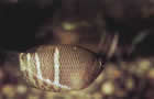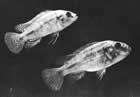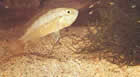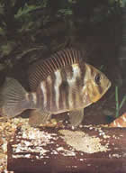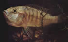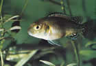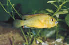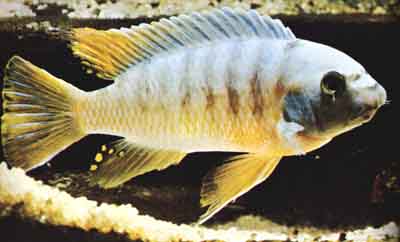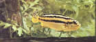 Pseudotropheus auratus (псевдотрофеус ауратус, ньясская золотая цихлида). Этот вид также обитает в озере Малави. Его длина 12,5см и более, хотя размножаться могут особи величиной 7,5см. Самец окрашен незамысловато, его единственное украшение – две черные полосы в центре и верхней части тела, однако в нерестовый период он становится темно-коричневым, даже черным, у него появляется голубовато-белая боковая линия, над ней еще одна, более узкая, а у основания спинного плавника светло-коричневая полоса. Самка обычно окрашена в яркий золотисто-желтый цвет с аналогично расположенными черными полосами, ограниченными светло-желтой зоной, и еще одной черной полосой на спинном плавнике, которая отсутствует у самца. Такая же окраска у нее обычно сохраняется и во время нереста.