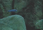Labeotropheus fuelleborni (лабеотрофеус). Это одна из цихлид-мбун из озера Малави, Африка, длиной 10 – 12,5см. Окраска обычно голубая с 6 – 8 темными вертикальными полосами. У самки есть две цветовые фазы: одна – бледно-голубая, даже зеленоватая, с более светлыми полосами и вторая – когда на общем голубом фоне появляются черные, оранжевые и белые крапинки, а на анальном (временами и на спинном) плавнике – желтые и ярко-оранжевые пятна.