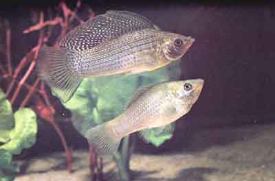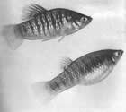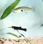 Poecilia heterandria (карликовая пецилия, или лимия). Родина – Венесуэла. Длина самок 5см, самцы вдвое меньше. Окраска этих миролюбивых пецилий дымчатая, брюшко белое, у самцов есть несколько темных вертикальных полос.