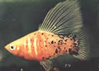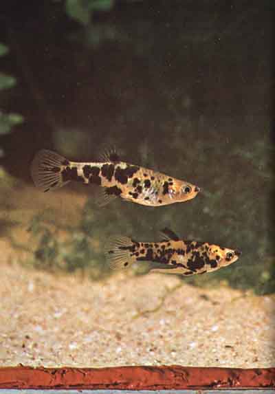 Xiphophorus maculatus (пятнистая, или зеркальная, платипецилия). Этот вид встречается от Мексики до Британского Гондураса. Длина самки 7,5см, самца 3,75см. Дикая рыба имеет коричневую окраску с несколькими голубыми пятнами на боках, у самца иногда немного краснеет спинной плавник. От этой внешне непривлекательной рыбы селекционеры в результате очень кропотливой работы вывели множество красочных линий: Red, Red Wag, Gold, Gold Wag, Black, Blue, Salt-and-Pepper, Bleeding Heart, Berlin, Tuxedo, Mixed и др. Все это прелестные формы, обладать которыми хотели бы многие, однако не забывайте, что при содержании в обществе сородичей они дадут смешанное потомство. Рыбка одной окраски не откажется от брачного союза с рыбкой совсем иного цвета. Поэтому, если вы поставили задачу вывести линию определенной окраски, не держите цветовые разновидности платипецилий в одном аквариуме. Это же относится и к другим меченосцам. Платипецилий – идеальные аквариумные рыбы, миролюбивые и выносливые. Меченосцы с высокими спинными плавниками в наше время встречаются повсеместно. Их первооткрывателем был Уильям Хиэрин, работающий главным образом с X variatus.