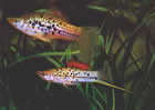 Xiphophorus helleri (зеленый меченосец, меченосец Геллера). Обитает от Мексики до Гондураса. Это еще один популярный вид живородящих рыб. Длина самок 10см, самцы немного меньше. Дикие формы, которые все еще встречаются в зоомагазинах, имеют синевато-зеленую окраску. У самцов около жаберных крышек начинается темно-бордовая горизонтальная полоса, ограниченная сверху и снизу золотистой зоной и проходящая до верхушки меча – очень длинных заостренных нижних лучей хвостового плавника. Вторая горизонтальная линия тянется вдоль нижнего края тела и заканчивается у нижнего края меча. Спинной плавник усеян красными крапинками. У самок также есть темно-бордовая линия, но отсутствует меч и крапинок на спинном плавнике гораздо меньше. Существует альбиносная разновидность X. helleri с розовыми глазами, светло-желтым телом, красными полосами и желтым мечом.