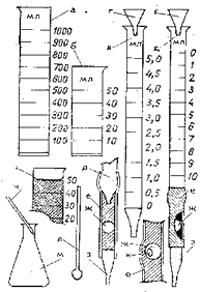 Рис. 54. К измерению жесткости воды: а — мерный цилиндр на 1000 мл, б — мерный цилиндр на 50 мл, в — мерная пипетка на 5 мл, г — воронка, д — бюретка на 10 мл, е — резиновая трубка, ж — запирающий клапан, з — пипетка, и — место ущемления пальцами резиновой трубки, к — мениск, л — глазная палочка, м — коническая колба, н — положение мерной пипетки при введении в колбу раствора.