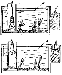 Освещение начинают с применения электроламп накаливания малой и средней силы. Наблюдая за тем, как чувствуют себя растения — растут или нет, прибавляют или уменьшают свет. Аквариум емкостью 30 л можно осветить двумя лампами накаливания, размещенными в светильниках-отражателях: 25 ватт сверху и 15 ватт сбоку. Для 50—60-литрового аквариума — сверху лампа 40 ватт, а сбоку 15 ватт. Эти лампы, особенно расположенные сбоку, являются одновременно и источниками тепла. Поэтому в случае перегревания воды боковые светильники отдаляют от стекол.