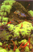 Появление карликовых, то есть вырастающих в условиях аквариума до размеров не более 8-10 см, цихлид дало первый толчок развитию популярности рыб этого интереснейшего семейства пресноводных обитателей. Их характер нельзя назвать образцовым, однако ввиду небольшого размера карликовые цихлиды просто не в состоянии нанести существенный урон другим обитателям аквариума. Они стремятся занять какой-нибудь определенный участок у дна и начинают прогонять оттуда непрошеных гостей, будь то рыбы других семейств или же их кровные сородичи, демонстрируя тем самым территориальное поведение. Если заранее позаботиться о сооружении подходящих укрытий для цихлид (это могут быть скорлупа кокосового ореха, коряги, сложенные из камней пещерки и т.п.), можно избежать перекапывания грунта и других неприятных сюрпризов (см. книгу «Цихлиды - рыбы с интеллектом»).