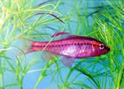 В отличие от большинства других видов, вишневые барбусы более пугливы и предпочитают густо заросшие водными растениями аквариумы, где любят прятаться в тени листьев. Поэтому их лучше содержать в компании с расборами и мелкими харацинидами (неонами, грацилисами и т.п.). Для размножения вполне достаточно аквариума длиной 20-25 см и объемом около 10 литров с густыми зарослями мелколиственных растений. Слой воды в нерестовике не должен превышать 18-20 см. Для разведения больше всего подходит температура 25-26° С. Несмотря на свой маленький размер, рыбы достаточно плодовиты. Самки обычно мечут до двух-трех сотен икринок, из которых на следующие сутки выклевываются личинки. Спустя еще примерно три дня они начинают плавать и питаться. При хорошем кормлении мальки растут быстро, и в трехмесячном возрасте уже можно различить самцов и самок.