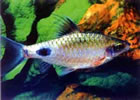 Солнечный барбус (Barbus gelius (Hamilton Buchanan, 1822)) встречается в водоемах центральной Индии, и поэтому считается у нас цейлонским барбусом, хотя самые большие поставки этих рыб осуществляются из Шри-Ланки, где они разводятся на аквариумных фермах в огромных количествах наравне с вишневыми и черными барбусами. Рыбки небольшие (до 4 см), миролюбивые и, по сравнению с другими барбусами, предпочитают прохладную воду (18-22° С). Кормление несложное: рыбы прекрасно поедают живые и сухие корма, а также нежные, мягкие водоросли, покрывающие листья растений, камни и коряги. Самцы ярче окрашены, самки крупнее. Несмотря на очень привлекательный внешний вид, неприхотливость и пригодность для содержания в общем аквариуме в компании мелких неагрессивных соседей, солнечные барбусы так и не стали популярными в России, хотя их неоднократно завозили из-за рубежа и успешно разводили в Москве. Для разведения достаточен аквариум объемом около 10 литров с уровнем воды до 15 см. Вода должна быть относительно мягкой (DGH около 5 градусов) и со слабокислой реакцией(рН=6-6.5). Повышение температуры на 23° С, ее освежение и смягчение стимулируют нерест солнечных барбусов. В качестве нерестового субстрата можно рекомендовать людвигию или гигрофилу. Рыбы малопродуктивны, и сотня мальков за один нерест от пары производителей может считаться очень хорошим результатом. При выкармливании молоди следует тщательно просеивать планктон и плавно переходить на увеличение размеров корма по мере роста мальков.