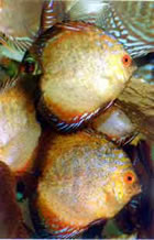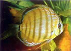 А вот с зеленым дискусом некоторая проблема - выловленные в природе дискусы кажутся зеленоватыми (иногда даже ярко-зелеными) из-за того, что изумительный золотисто-желтый фон основной окраски тела смешивается с отсветом голубого неба. Именно последнее обстоятельство вносит множество недоразумений и путаницы в умы любителей. знакомых с этими рыбами только по фотографиям в книгах и журналах.