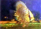Желтовато-розовый основной цвет, как будто припорошенный пылью, поглощающей световые лучи, а иногда искрящейся, характеризует истинное творение рук человека - цветовую вариацию дискусов Pigeon Blood (в переводе с английского - голубиная кровь).