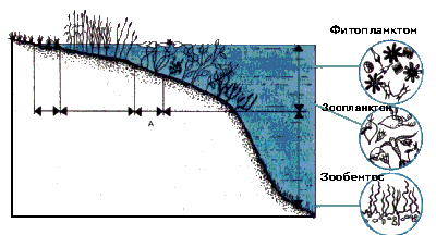 Характерным примером экологической системы может служить водоем. В прибрежной (литоральной) зоне А сосредоточены растения, водоросли, планктон, Ниже у дна — бентос