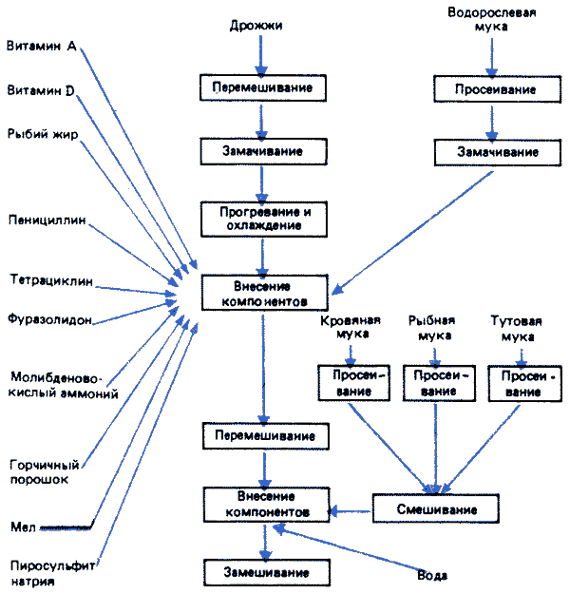 5. В охлажденные дрожжи при постоянном тщательном перемешивании вносят: пенициллиновый мицелий (или пенициллин), витамины, рыбий жир, биомицин (тетрациклин), фуразолидон, молибденовокислый аммоний, горчичный порошок, пиросульфит натрия и набухшую водорослевую муку. Полученную полужидкую массу замешивают с сухой смесью кровяной, рыбной и тутовой муки при постепенном добавлении оставшегося количества воды для получения желаемой консистенции.