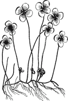 Листья темно-зеленые, четырехлопастные, похожие по форме и расположению на листья кислицы (Oxalis acetosella).