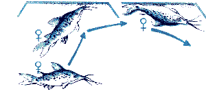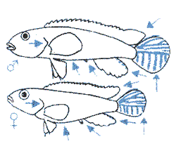Вопрос о половых различиях интересует практически всех аквариумистов. Как ни странно, но не исключена возможность посадить на нерест одних самок или, наоборот, одних самцов и ждать результата, так как ясно выраженные половые различия имеют далеко не все рыбы. Но у многих видов различия пола выражены хорошо. Например, у рыбок, не заботящихся о своем потомстве, самки крупнее самцов, тем самым обеспечивается их большая плодовитость. Самцы, охраняющие потомство, как правило, крупнее самок. У рыб многих видов самцы бывают ярче окрашены, чем самочки (нотобранхиусы, гуппи, огненные барбусы, лялиусы, стеклянные окуни и пр.), или, наоборот, самочки ярче самцов (попугайчики, например). У некоторых цихлид самочки и самцы окрашены красиво, но имеют разный цвет. Например, у псевдотрофеуса ломбардо взрослые самцы апельсинового цвета, а самочки ярко-голубого (мальки окрашены, как самочка). У желто-голубого псевдотрофеуса и псевдотрофеуса Соколофа, наоборот, голубой самец, а самочка желтая. Полиморфный вид — псевдотрофеус зебра имеет около десяти вариантов окраски — от белого и голубого до оранжевого и красного цветов, при этом самец, например, может быть голубой, а самочка красная. Одним словом, если точно известно название вида, у таких рыбок перепутать взрослую самочку и самца трудно.