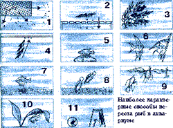 Икринки в пенные гнезда, плавающие на поверхности, как это показано на схеме 9, откладывают популярные, хорошо известные аквариумистам лабиринтовые рыбки (петушки, лялиусы, макроподы, гурами и др.). Но есть рыбки, строящие пенные гнезда под широкими листьями ближе к поверхности воды. К таким, например, относятся сомики рода хоплостернум и дианема, которые выбирают место для постройки пенного гнезда под широким плавающим листом (например, нимфеи). Если в аквариуме нет таких растений, их можно заменить плавающими пластинками из пенопласта (вниз глянцевой стороной) или пластиковыми тарелочками.